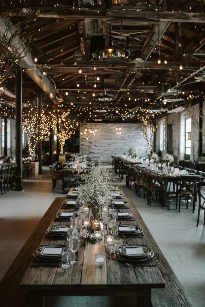 This breathtaking reception is set within a spacious, moody industrial venue that features stunning exposed wooden ceilings and raw columns, giving it an authentic rustic feel. The atmosphere is completely transformed by the sheer number of twinkling string lights draped across the ceiling and wrapped around tall, bare tree branches, creating a magical, enchanting glow everywhere. Long, beautiful dark wooden tables anchor the space, set with dark place settings and simple arrangements of soft white filler flowers and greenery, all flickering under the candlelight. It’s the perfect blend of natural texture and soft, romantic illumination.