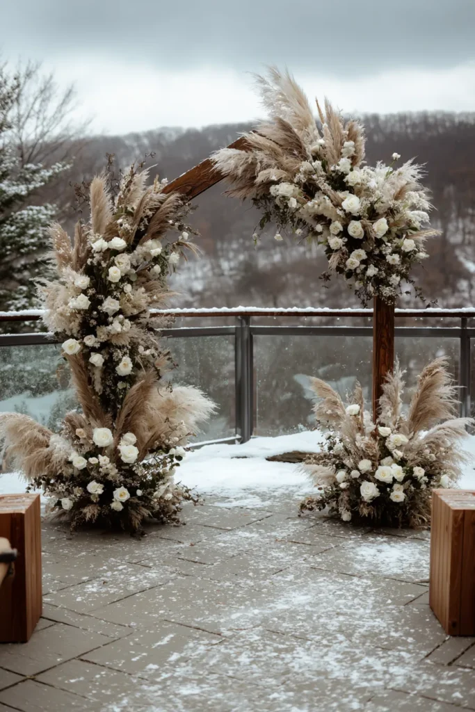 This breathtaking wedding arch is framed by a simple yet sturdy dark wood structure, creating a rustic and natural focal point against a snowy mountain backdrop. The design is absolutely lush, featuring generous arrangements of creamy white roses nestled among various green foliage like eucalyptus and pine. What really makes this arch feel unique and trendy is the dramatic use of fluffy, pale beige pampas grass, which adds incredible texture and a romantic, bohemian flair. It’s a gorgeous mix of soft florals and earthy textures, sitting perfectly on a snow-dusted stone patio overlooking a winter wonderland view.