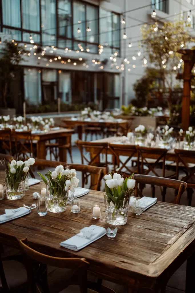 This delightful setup captures an enchanting outdoor wedding reception nestled within an urban courtyard, perhaps a hotel or restaurant patio, beautifully illuminated by countless twinkling string lights strung overhead. The focus is on long, rustic farmhouse-style wooden tables paired with classic cross-back chairs, creating a relaxed yet chic atmosphere. Each table is adorned with simple white linen napkins and charming centerpieces of fresh, crisp white tulips in clear glass vases, accented by tiny votive candles that cast a soft, romantic glow. It’s a wonderful blend of natural warmth from the wood and bright elegance from the white florals and lights.