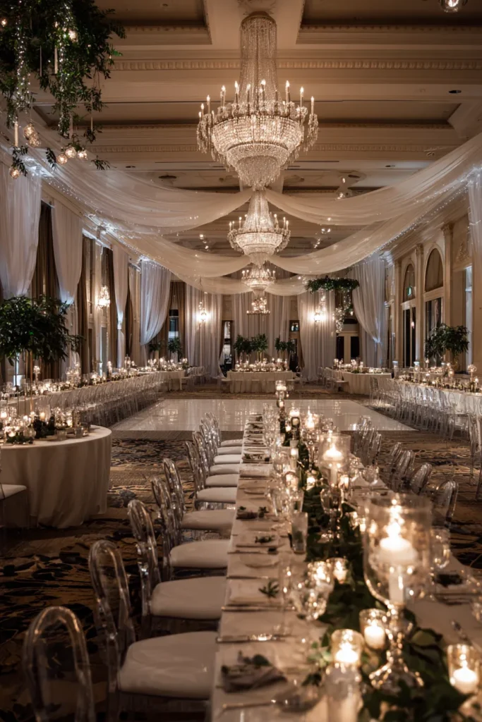 This grand ballroom is completely transformed into an opulent and incredibly intimate wedding space using dramatic sheer white fabric draping across the ceiling and walls, softening the room beautifully. The stunning focal points are the massive, sparkling crystal chandeliers hanging low over a central dance floor, casting a warm, romantic light everywhere. Tables are arranged in long, elegant rows, featuring gorgeous table runners made of lush green garlands and an abundance of flickering pillar candles and votives in varying sizes and clear glass holders. Modern, sleek ghost chairs and crisp white linens complete this look of refined, candlelit luxury.
