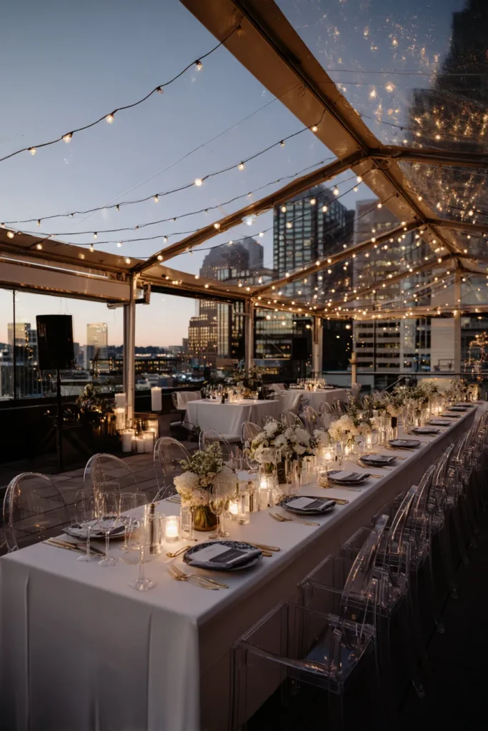 This incredible setting is a clear-top tent covering a chic rooftop patio, giving guests a breathtaking skyline view while keeping them cozy and warm. The atmosphere is totally sophisticated and modern with a long banquet table draped in crisp white linen and lined with sleek ghost chairs. The tablescape is pure elegance, featuring low arrangements of white and green florals, metallic gold accents, and lots of warm candlelight in clear holders. Overhead, string lights twinkle like stars and perfectly reflect the city lights below, creating such a romantic and vibrant nighttime glow.