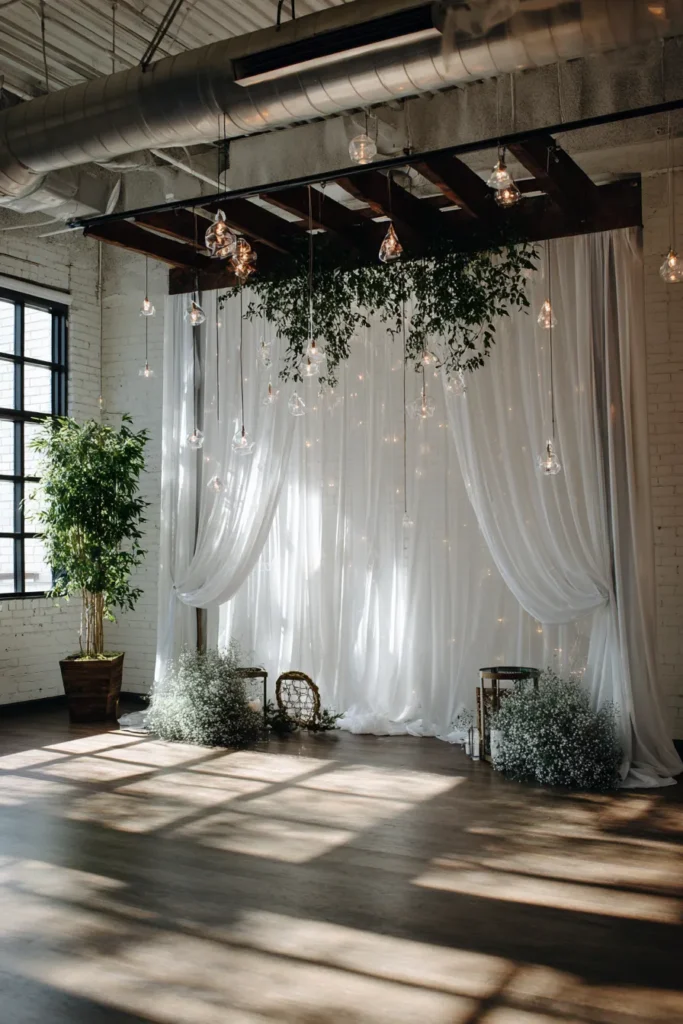 This image features a dreamy indoor ceremony backdrop created within a cool, industrial loft space, evident from the exposed brick and ceiling pipes. The atmosphere is immediately softened by billows of sheer white fabric drapery, creating a delicate, flowing curtain effect. This is anchored by a raw wooden beam structure overhead, from which lush greenery spills down, adding a touch of natural elegance. What truly elevates this look is the scattering of delicate, hanging glass orb lights and fairy lights, which look like sparkling raindrops. At the base, fluffy mounds of baby’s breath add a charming, soft cloud-like finish.