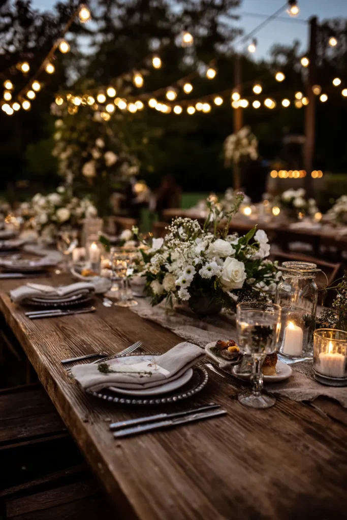 This charming setup features a long, weathered farmhouse wooden table running down the center, giving the whole scene a wonderfully rustic and relaxed feel. The table is dressed simply with a neutral linen runner and stacked with classic white plates, soft gray napkins, and sleek silver flatware. The real magic comes from the abundant candlelight in clear glass jars and the lovely, low floral arrangements featuring white roses and tiny white filler flowers. Overhead, numerous warm string lights are strung across the space, creating an enchanting glow that makes the surrounding dark evening feel incredibly intimate and inviting.