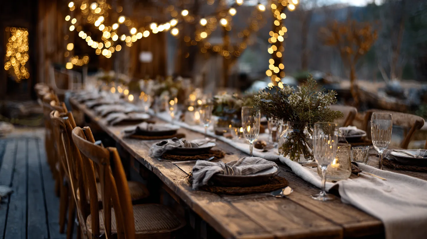 I just adore the genuine warmth and rustic elegance radiating from this design—it’s honestly pure perfection! The simplicity of the rough wooden table next to the soft elegance of the white flowers and that beautiful, glowing light is such a wonderful contrast. I think the key to making a winter evening feel so cozy is that massive amount of warm candlelight and those twinkling string lights. They just wrap the whole scene in a romantic, golden hug. It’s the ultimate inspiration for a relaxed yet incredibly chic and memorable celebration.