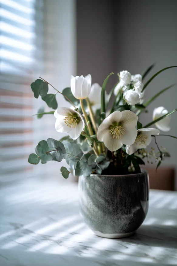 This arrangement is all about natural, ‘just-picked’ beauty. The stars are those gorgeous white hellebores, also known as Lenten roses, with their charming green centers. They’re mixed with a few elegant white tulips and some smaller, airy white blooms. Soft, silvery-green eucalyptus leaves fill out the base, adding texture and that classic wintry feel. It’s all brought together in a lovely, simple ceramic pot with a muted grey-green finish.