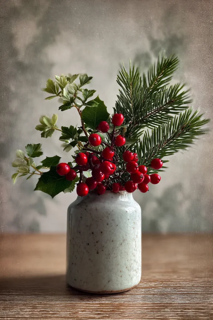 This charming little arrangement uses traditional winter elements in a really fresh way. It features bright red winter berries clustered together, which pop against the dark green pine needles. A few sprigs of variegated holly leaves add a lovely touch of light green. Everything is set in a simple, speckled ceramic bottle vase with a soft, matte white glaze, which keeps the look clean and modern.