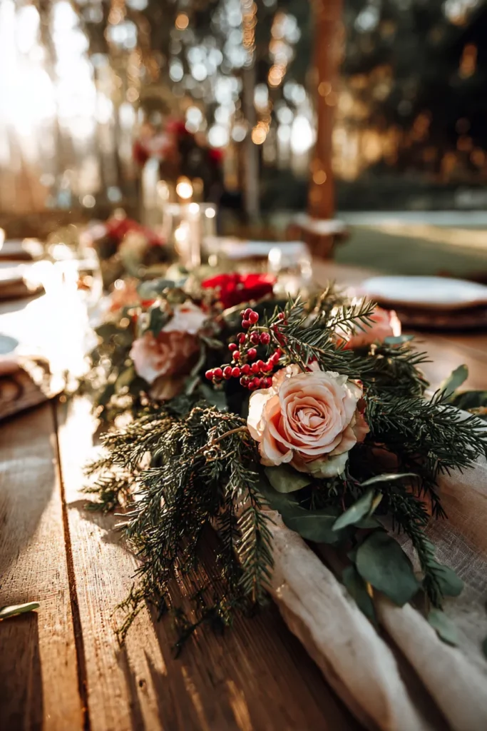 This beautiful piece is designed to run right down the center of a long table, creating such a dramatic effect. It’s a lush mix of deep green evergreen boughs and silvery eucalyptus leaves that flow gorgeously across the surface. Soft, blush pink and peach roses are tucked in along the garland, bringing a beautiful, romantic warmth. Clusters of vibrant red hypericum berries add that crucial pop of winter color and texture throughout the whole design.