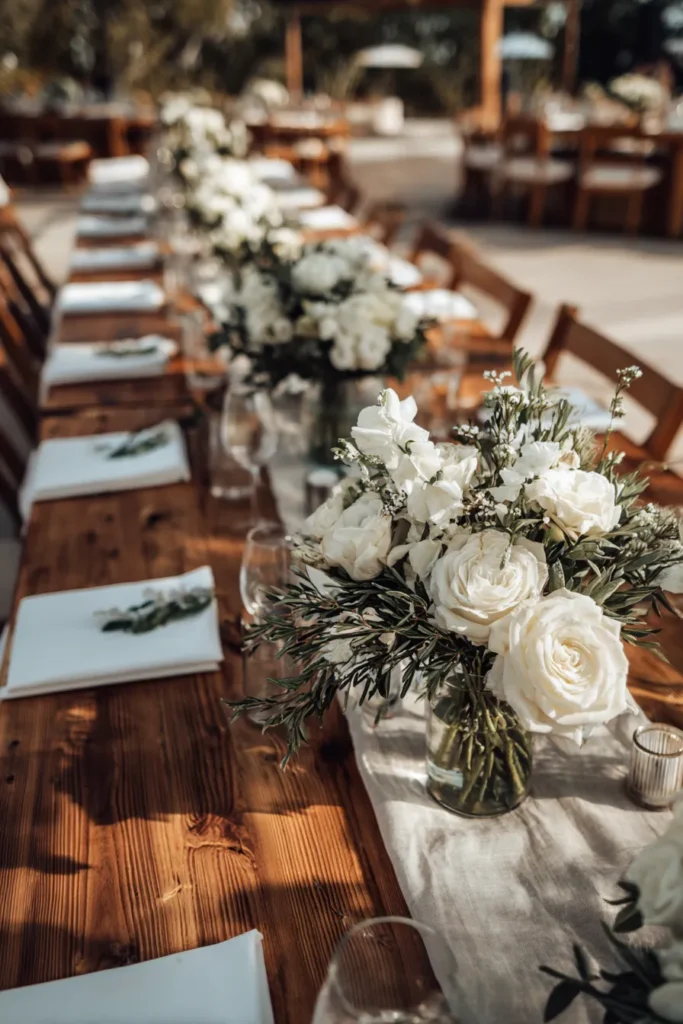 I just think this setup is absolutely dreamy. The contrast between the brilliant white flowers and the dark, flowing greenery is so sophisticated and timeless. I love how the simple, rustic wooden table and the natural linen runner keep the look grounded. This is the perfect choice for a winter wedding if you’re trying to avoid the traditional pine and berries but still want a natural and chic feel. It’s truly a breath of fresh air.