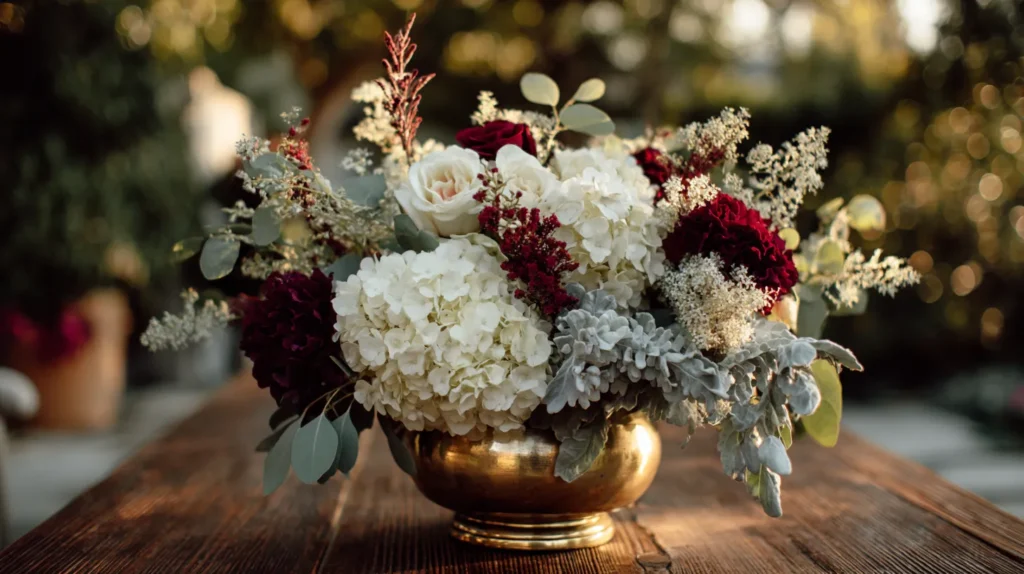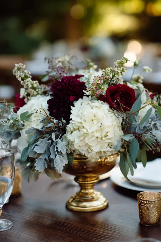 This centerpiece is absolutely stunning, bringing a truly regal and luxurious feel to the table. It features gorgeous white hydrangea clusters mixed with deep, moody burgundy dahlias and rich red roses. The arrangement is surrounded by soft, silvery-green dusty miller and some dark, textural foliage that makes it feel seasonal. All those beautiful florals are perfectly set in a fabulous golden compote bowl, giving the arrangement serious height and glamour.