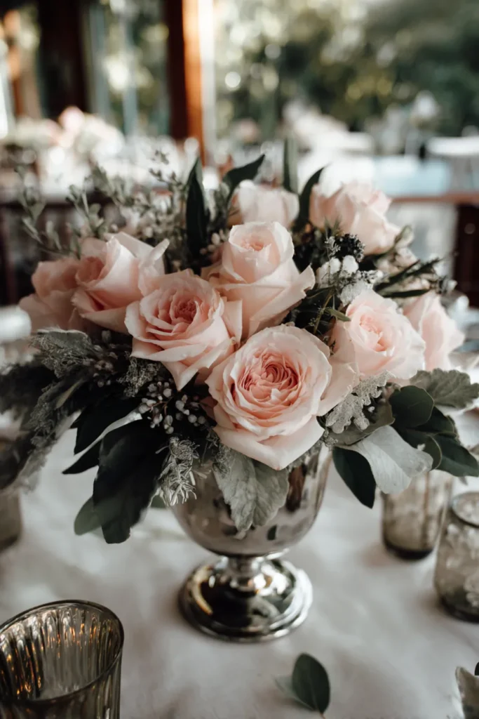 I am simply in love with this combination. That soft blush pink with the silvery leaves and the shiny vase is just a dream for a winter wedding. It feels so sophisticated and timeless. I love how the silver vase adds a touch of glamour and makes the whole arrangement feel so special. It’s the perfect way to bring softness and romance to a winter table without feeling cold. So, so pretty.