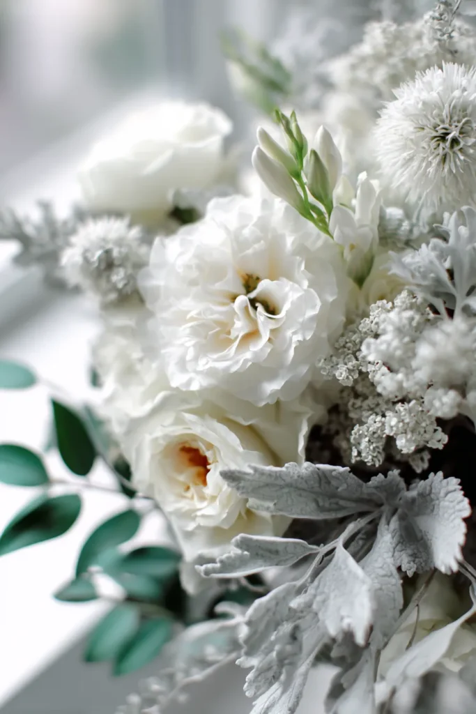 This bouquet is a masterpiece of winter whites and cool tones. It combines a variety of white blooms, including lush garden roses, ruffled ranunculus, and perhaps some delicate dahlias, all creating incredible texture. What truly sets it apart are the generous amounts of silvery-grey foliage, like dusty miller and a spiky plant that adds a frosted, ethereal quality. A few sprigs of deeper green leaves are tucked in for contrast, preventing it from feeling too monochromatic.