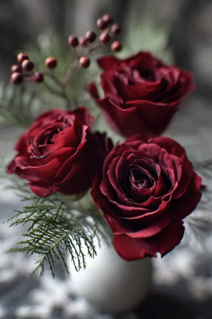 This is such a simple, yet dramatic arrangement that relies on color and texture to make an impact. It features three stunning, deep moody red roses with layers of velvety petals. They are surrounded by soft, muted silvery foliage and spiky, dark evergreen sprigs that anchor the look in the winter season. The whole piece is placed in a small, matte white vase, which is the perfect modern contrast to the deep, traditional reds.