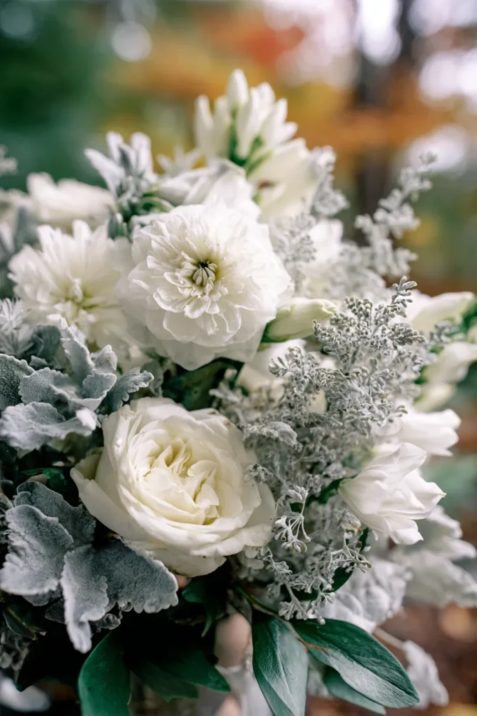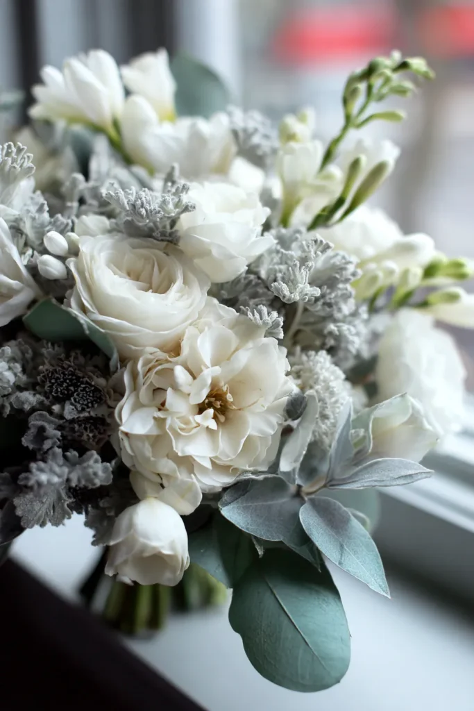 This bouquet is a beautiful symphony of soft whites and cool greens, perfect for a chic winter wedding. It features a lovely variety of white blooms, including classic roses, ruffled ranunculus, and some delicate bell-shaped flowers, all tightly clustered for a lush feel. The truly seasonal touch comes from the generous use of dusty miller and silvery eucalyptus leaves, which provide a beautiful frosted look. Some darker green foliage is also visible, adding depth and contrast to the lighter elements.