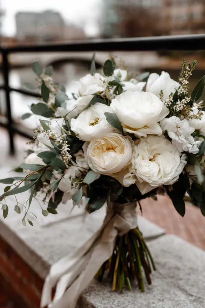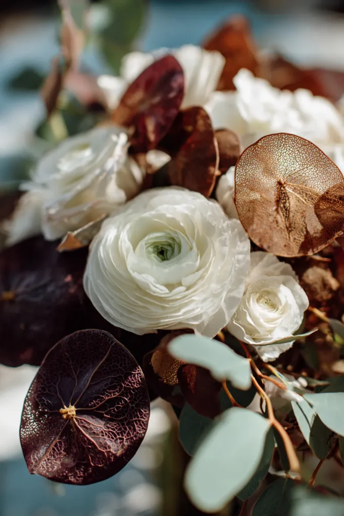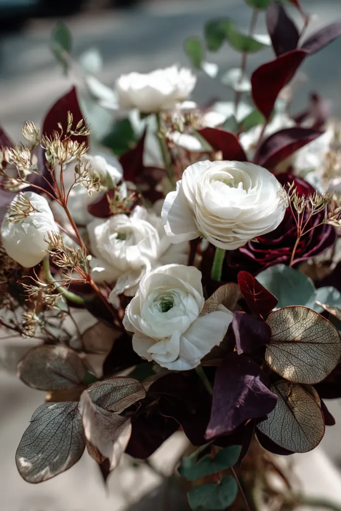 I am completely obsessed with this combination. I love how the creamy white flowers almost glow against the dark, moody foliage. It feels incredibly artistic and so different from typical winter arrangements. This is the perfect choice for the bride who wants a sophisticated, high-fashion look with a hint of dramatic flair. The balance of soft petals and those edgy dark leaves is just perfection. It’s truly a statement bouquet.