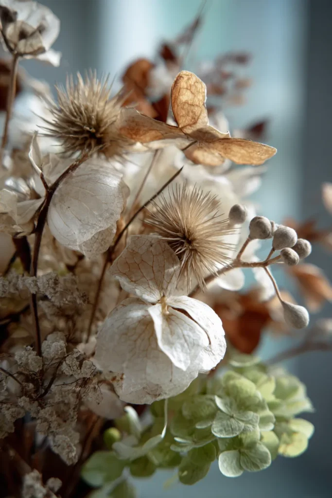 This arrangement celebrates the subtle beauty of dried winter florals. It features delicate, dried hydrangea petals that have a lovely papery texture, mixed with fluffy seed heads and spiky, natural thistles. There are also beautiful, light brown honesty seed pods tucked in, adding a hint of warmth. The look is grounded by soft, dusty green foliage at the base, giving it just a little bit of fresh color.