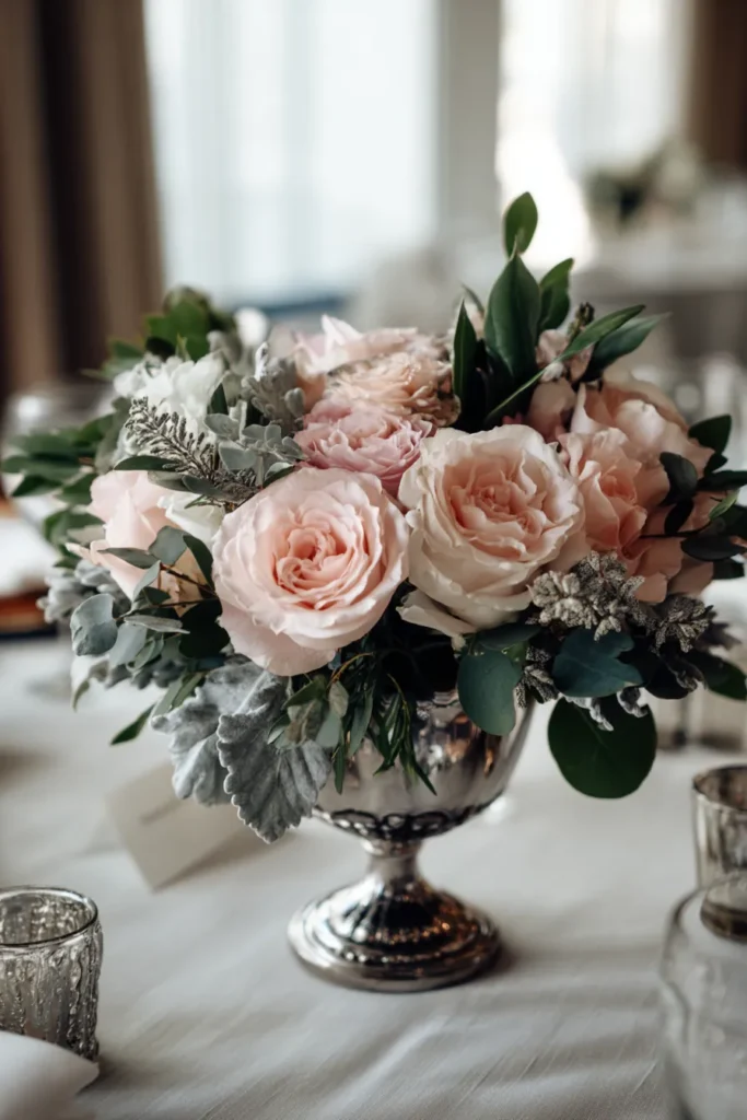 This centerpiece is pure romance. It’s overflowing with lush, pale pink garden roses, all soft and velvety. What makes it feel so right for winter is the mix of foliage. You’ve got those beautiful, frosty-looking dusty miller leaves and some deep green greenery tucked in. It’s all arranged beautifully in a polished, vintage-style silver compote bowl, giving it a really classic and elegant height.