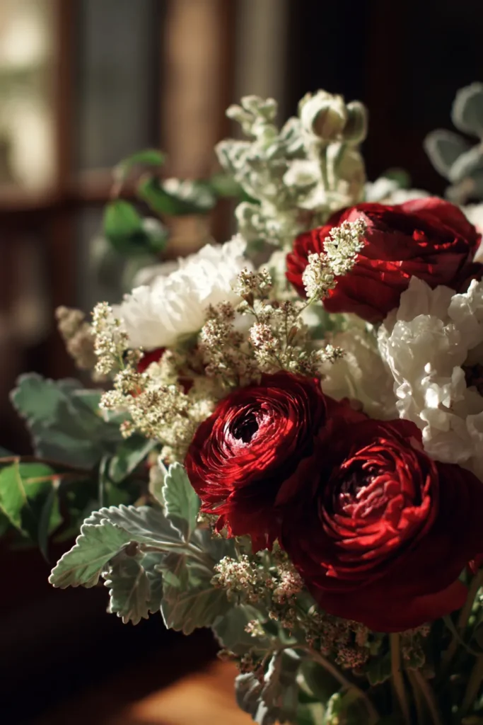 This arrangement is an absolute jewel for a winter celebration. It prominently features stunning, deeply colored burgundy ranunculus with their beautifully layered petals. These rich blooms are perfectly contrasted with fluffy white lisianthus and touches of white roses. The seasonal vibe comes from the generous use of soft, silvery-grey dusty miller foliage and some delicate, airy white filler flowers.