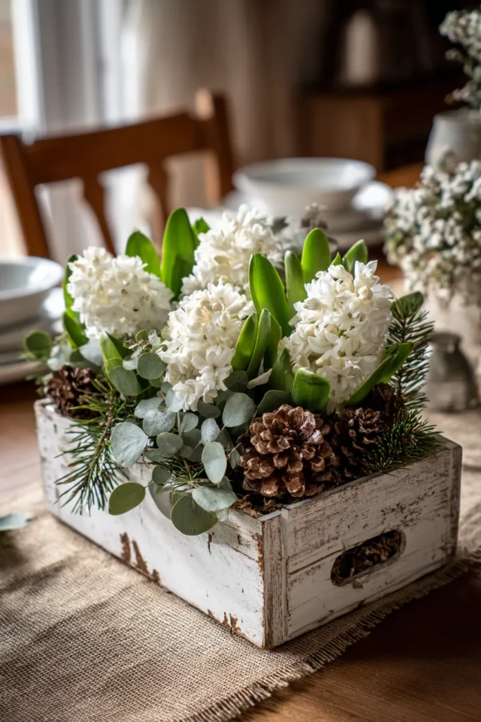 This centerpiece is such a charming and fragrant choice for a winter wedding. It features clusters of beautiful, plump white hyacinths with their bright green leaves, bringing a lovely freshness to the table. These are nestled into a rustic, distressed white wooden box, which gives it such a cozy farmhouse vibe. The hyacinths are surrounded by natural pine needles, eucalyptus, and several large, textured pinecones, adding fantastic woodland charm.