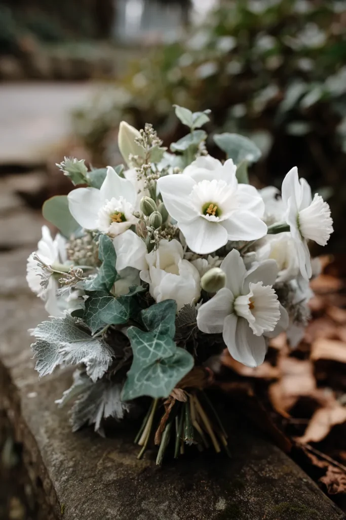 I am absolutely charmed by how fresh and delicate this bouquet is. I love that it uses flowers that bloom naturally in winter, giving it such an authentic and understated elegance. The contrast between the crisp white blooms and the frosted grey and dark green leaves is simply beautiful. This would be perfect for a bride wanting a natural, timeless, and slightly whimsical look. It’s so pretty and feels like a breath of fresh, crisp air.