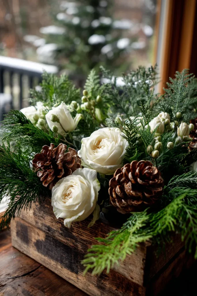 This arrangement is all about rustic charm. It’s set in a weathered wooden box, giving it a real farmhouse feel. Inside, creamy white roses are nestled among tons of wintery greens, like cedar and pine branches. Big, natural pinecones are tucked in, adding amazing texture. There are also some little white buds or berries mixed in, which adds another layer of detail.