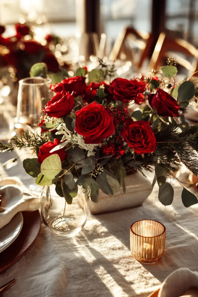 This centerpiece is such a classic, and for good reason. It’s absolutely packed with velvety, deep red roses that bring so much warmth to the table. They’re beautifully arranged with lots of silvery-green eucalyptus and some delicate sprigs of evergreen for a perfect winter touch. The whole thing is set in a simple, low, and modern-looking cream vase that lets the flowers be the star.