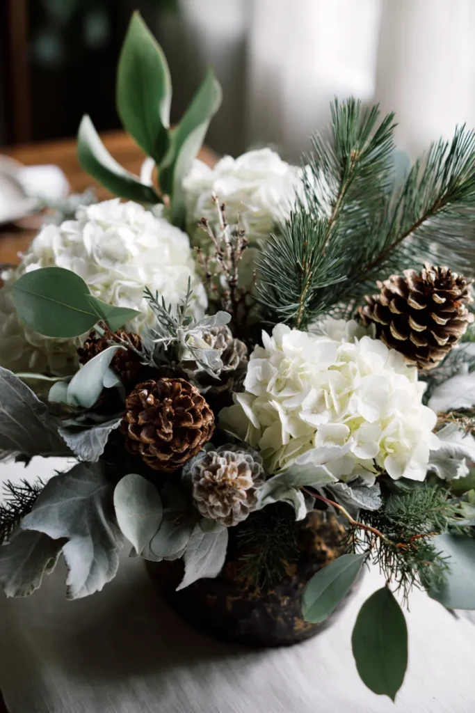 I am so here for this look. It’s like a perfect little piece of a snowy forest. I love how the super-soft, almost pillowy hydrangeas look next to the rustic pinecones and spiky pine needles. It’s such a fantastic contrast. This is the perfect way to get a “winter wonderland” vibe that still feels totally natural and not at all cheesy. It’s just so cozy and elegant at the same time.