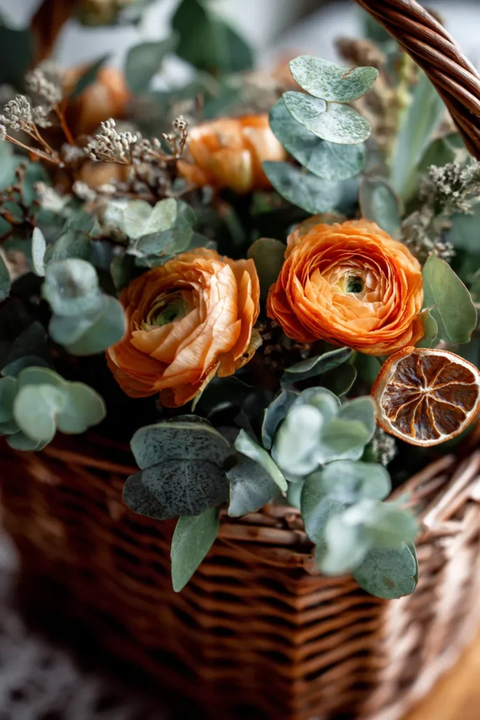 This arrangement is an absolute burst of warmth. It features beautiful, multilayered orange ranunculus blooms, which bring a gorgeous pop of color to the arrangement. They are nestled inside a rustic, woven wicker basket, which gives it a super cozy and natural texture. Silvery-green eucalyptus leaves are used throughout, creating a lovely contrast with the bright orange. The whole look is finished off with a really fun detail, a couple of dried orange slices that add a wonderful seasonal touch.