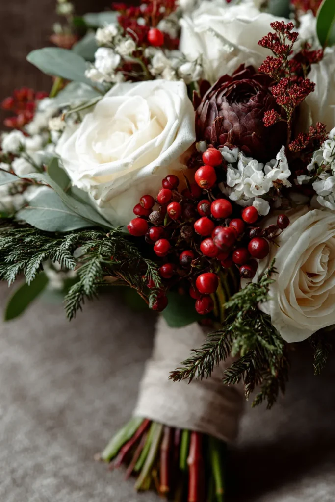 I think this arrangement is absolutely stunning for a bride getting married in the colder months. I love the contrast between the pure white flowers and the deep, rich colors of the protea and the berries. It feels so luxurious and traditional, but the mix of textures keeps it fresh and interesting. That pop of cranberry red makes it feel festive without being overly Christmassy. It’s truly a classic, sophisticated look.