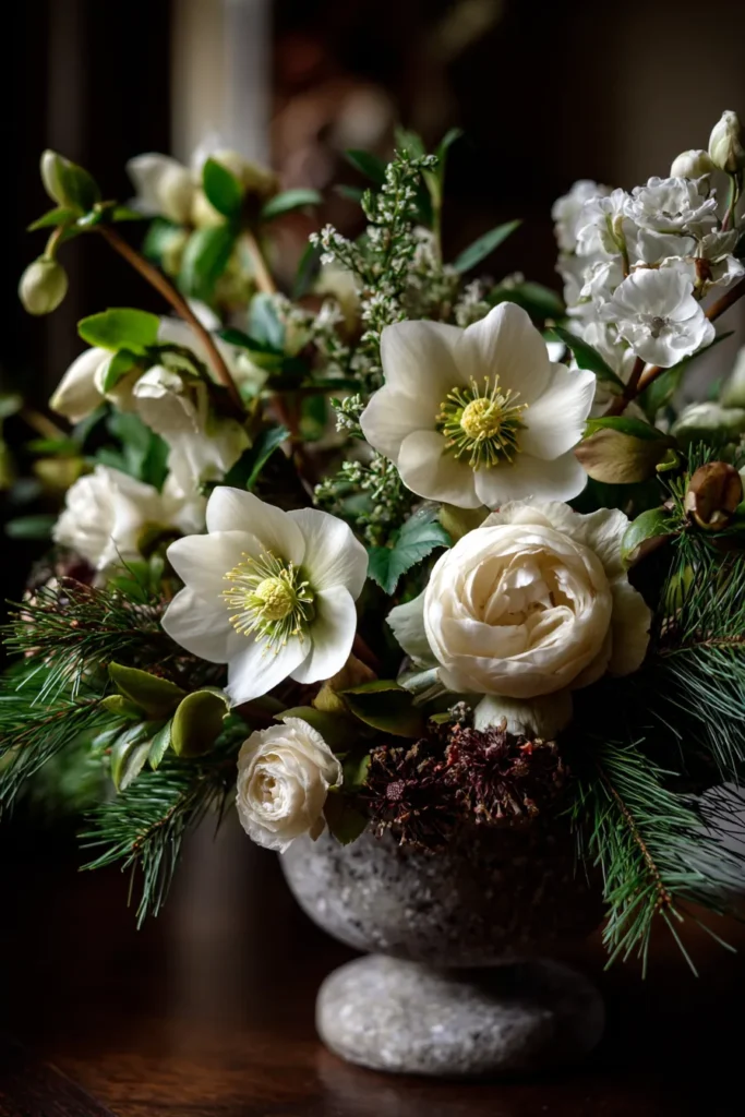 This is a beautiful example of a truly seasonal and natural arrangement. It features those incredible, snow-white hellebore blooms with their vibrant green centers, mixed beautifully with creamy white roses. The arrangement is packed with deep, lush evergreen needles and some darker burgundy accent foliage, which really brings in that forest feel. The base is an amazing textured stone vase that elevates the entire look with its natural, rugged feel.