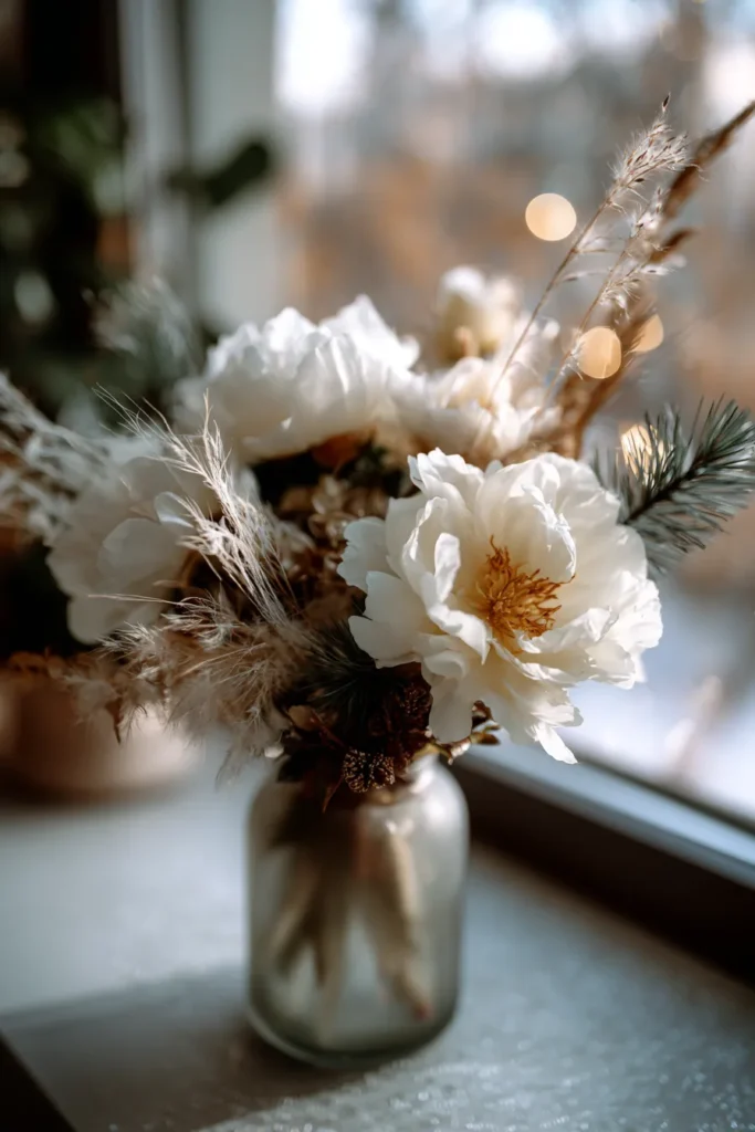 This arrangement combines two of my favorite textures for a beautiful bohemian winter vibe. The star of the show is the fluffy, layered white peony or garden rose with its lovely yellow center. It is surrounded by wispy, natural pampas grass and soft, dried wheat elements. A few touches of dark pine needles are tucked in, which gives it that seasonal contrast. It’s set perfectly in a small, slightly frosted glass vase that catches the light beautifully.