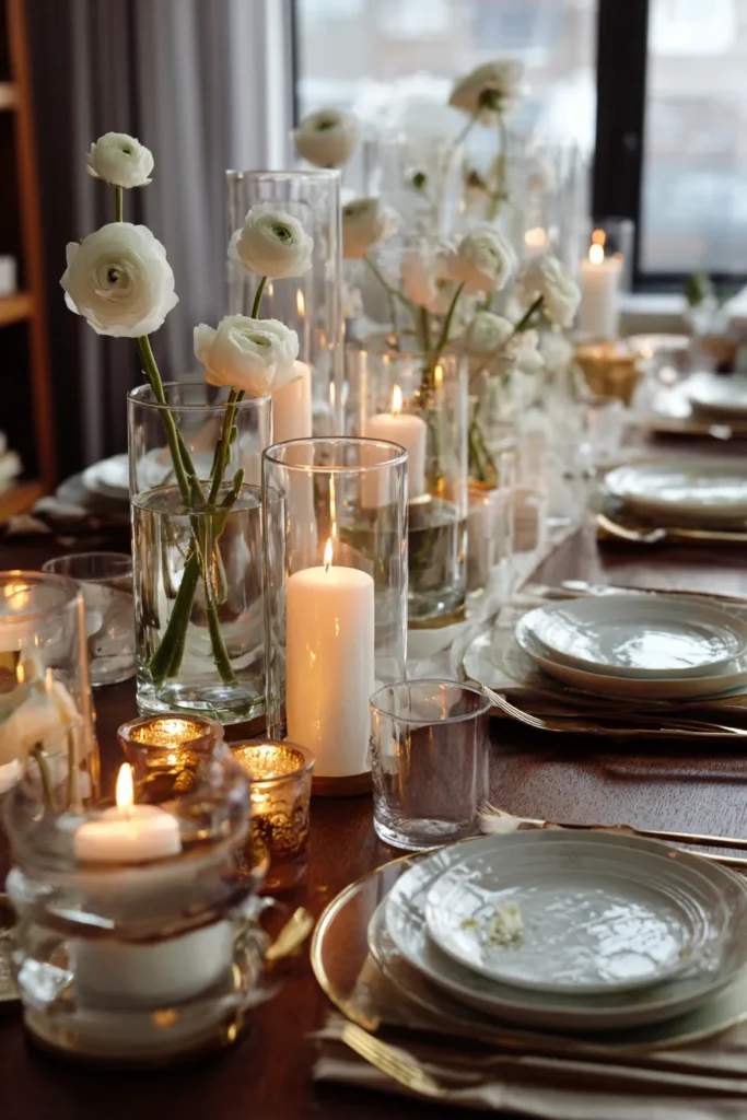 This gorgeous table setting is a masterclass in understated elegance and beautiful light play, making it perfect for a chic winter gathering. The centerpiece features multiple clear glass cylinder vases of varying heights, holding both creamy white ranunculus and thick white pillar candles. This combination of florals and flickering light creates a truly romantic, layered effect down the center of the dark wooden table. Surrounding these tall elements is a mix of mercury glass votives and small clear tumblers, all sparkling in the candlelight. The place setting is finished with a pale gray or white plate and shimmering gold flatware, adding a final touch of refined luxury.