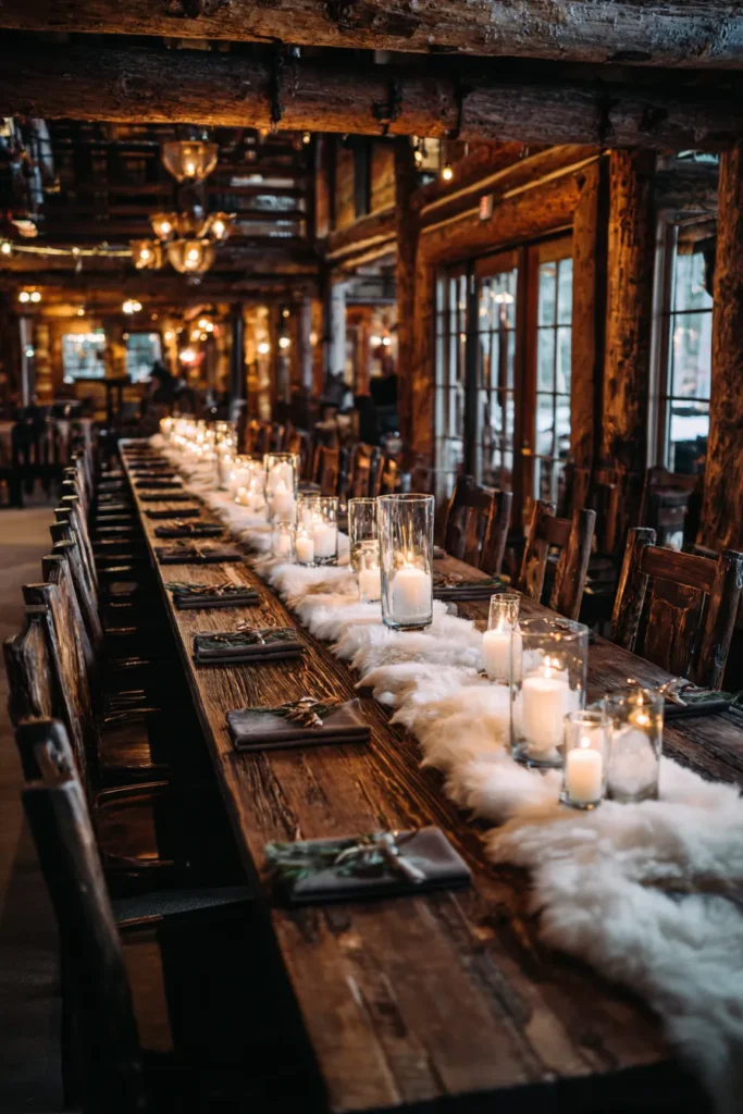 This long dinner table is the epitome of rustic luxury for a winter gathering, set within a stunning lodge with exposed wooden beams and a truly warm atmosphere. The foundation is a gorgeous, natural wood farm table with a rich, textured surface, instantly inviting guests to gather. Down the center runs a plush, faux fur runner in soft white, creating a dreamy, snow-like effect that feels incredibly cozy. Along this runner, a generous scattering of pillar candles of various sizes, nestled within clear glass hurricanes and votives, casts a warm, flickering glow across the entire table. Each place setting features a simple, dark napkin tied with twine and a sprig of fresh evergreen, adding a touch of natural elegance.
