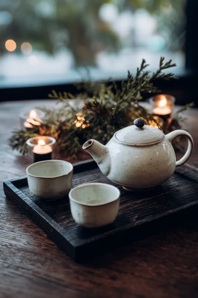 This serene vignette creates the most delightful and tranquil spot for a cozy winter tea moment. It features a beautifully minimalist ceramic teapot and two matching cups with a lovely, speckled finish, all nestled on a sleek, dark wooden tray. The entire setup is placed on a rich, dark wood table, which provides a warm and grounding backdrop. The ambience is utterly magical thanks to the surrounding elements; a small cluster of fresh evergreen sprigs adds a touch of natural, wintery greenery, and several flickering votive candles in clear glass holders cast a soft, inviting glow. In the background, softly blurred lights hint at an enchanting outdoor setting, enhancing the intimate feel.