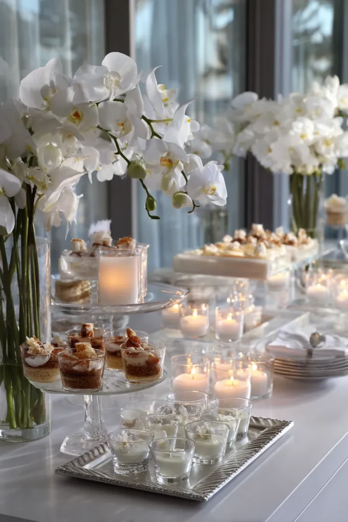 This elegant dessert bar is a vision of crisp white sophistication combined with inviting warmth, creating a truly luxurious display. The table is laden with an array of delectable treats, from petite layered desserts in glasses to beautifully decorated mini cakes and possibly some pastries, all presented on varying heights of clear glass and white ceramic stands. The showstopper floral arrangements are stunning tall vases filled with cascading white orchids and full bouquets of white flowers, adding an air of pure grace and romance. Hundreds of small, glowing votive candles are artfully scattered across the table in clear glass holders and on silver trays, casting a soft, warm light that makes everything sparkle.