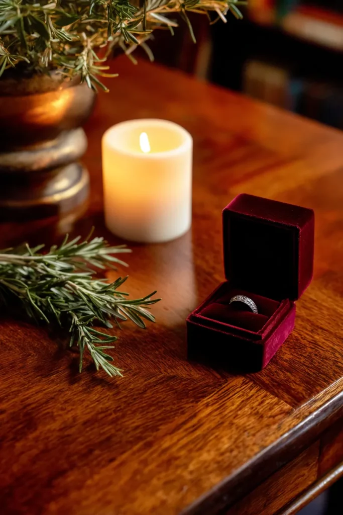 I honestly think this is just the most beautiful, sophisticated way to photograph an engagement or celebrate a significant moment. I mean, that deep velvet box is so luxurious, and the way it sits against the warm wood is just timeless and perfect. I absolutely adore that the inclusion of the simple candle and the fresh rosemary makes it feel grounded and cozy, not overly fussy. It’s romantic, it’s dramatic in the best way, and it’s a wonderful reminder that sometimes, the simplest details—like a candle and a beautiful box—make the biggest, most intimate statement.