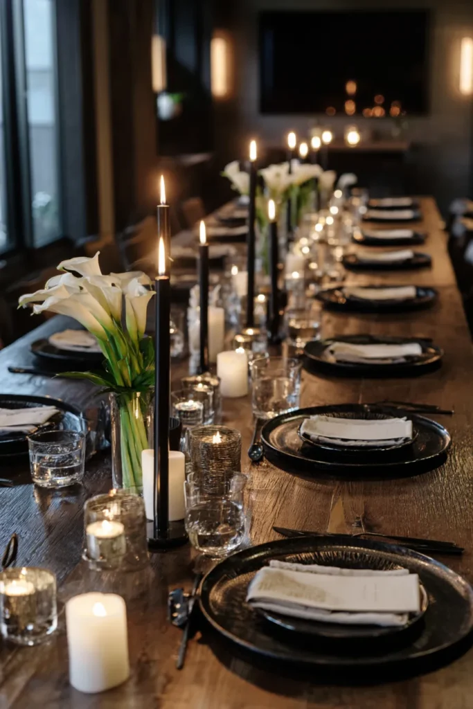 This striking table setting is a dramatic and modern take on romantic winter elegance, using high-contrast black and white for a bold statement. The table itself is a gorgeous, natural-toned wooden surface that provides a warm, rustic backdrop for the sleek items. The centerpiece is anchored by elegant, tall black taper candles in varied heights, mixed with stunning white calla lilies arranged in clear glass vases. The place settings feature matte black charger plates topped with folded white or light-toned napkins, creating that gorgeous, sharp contrast. The whole display is surrounded by the soft, shimmering glow of votive candles in textured mercury glass holders, softening the severity of the black and white.