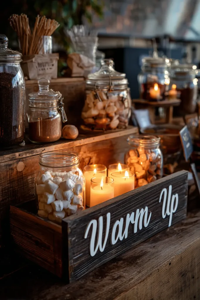 I just think this setup is absolutely adorable and such a thoughtful touch for a chilly winter event; it just screams “come get cozy”! If you’re into creating those sweet, interactive moments for your guests, this is pure gold. I love how the wooden textures pair with the clear glass jars and that sweet “Warm Up” sign is just too cute for words. The way all those soft candles are flickering around the goodies makes everything look so much more tempting and inviting. It’s the perfect spot to grab a treat and a warm drink, and it feels like a big, comforting hug in design form.