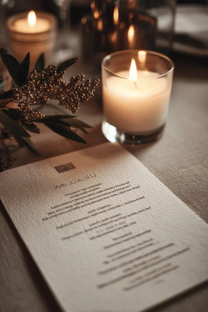 I just think this is such a charming and thoughtful detail that truly makes a table feel special and personal for a winter celebration. If you’re into those small but impactful touches, this is definitely one to bookmark. I adore how the soft, warm glow of the candle just makes everything feel so much more inviting and romantic, and that little sprig of greenery is such a sweet, natural accent. It’s elegant without being over-the-top, and it really shows that even the smallest elements can contribute so much to a cozy and memorable ambiance. It makes me want to reach out and touch that lovely textured menu!