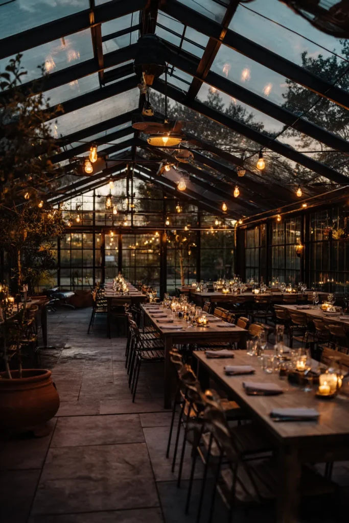 This incredible glasshouse space provides the most breathtakingly romantic setting for a winter dinner, making you feel like you’re dining under the stars while staying perfectly cozy. The structure features a high, dark-framed glass ceiling and walls, allowing the natural twilight and surrounding trees to become part of the decor. Hanging overhead, a scattering of large, Edison-style bare bulb lights adds an industrial-chic twinkle. Long rustic wooden tables are set up end-to-end, each one adorned with dozens of flickering votive candles and pillar candles in low glass holders, creating an intimate, warm glow that bounces beautifully off the glass. The dark wooden chairs and simple place settings keep the focus purely on the magical lighting and the stunning architectural backdrop.