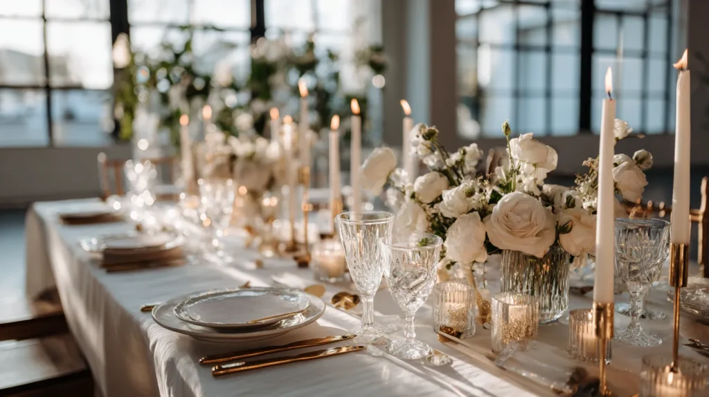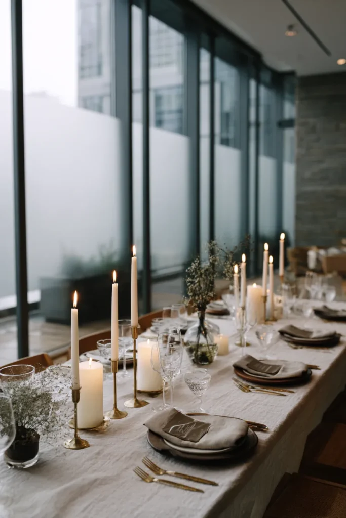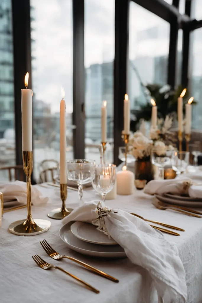 This elegant table setting offers a sophisticated blend of classic romance and modern urban chic, perfect for a winter event with a stunning view. The long table is draped in a crisp, white linen tablecloth, providing a clean and bright foundation. The decor is all about mixing textures and metallics; tall, slender white taper candles in elegant gold candle holders create varying heights and a soft, inviting glow. Place settings feature neutral-toned plates, topped with a soft white linen napkin held by a decorative, textured napkin ring. The table also includes smaller pillar candles in glass votives, and the entire scene is bathed in a mix of natural light from large windows and the warm flicker of candlelight, with a subtle floral arrangement in the background.