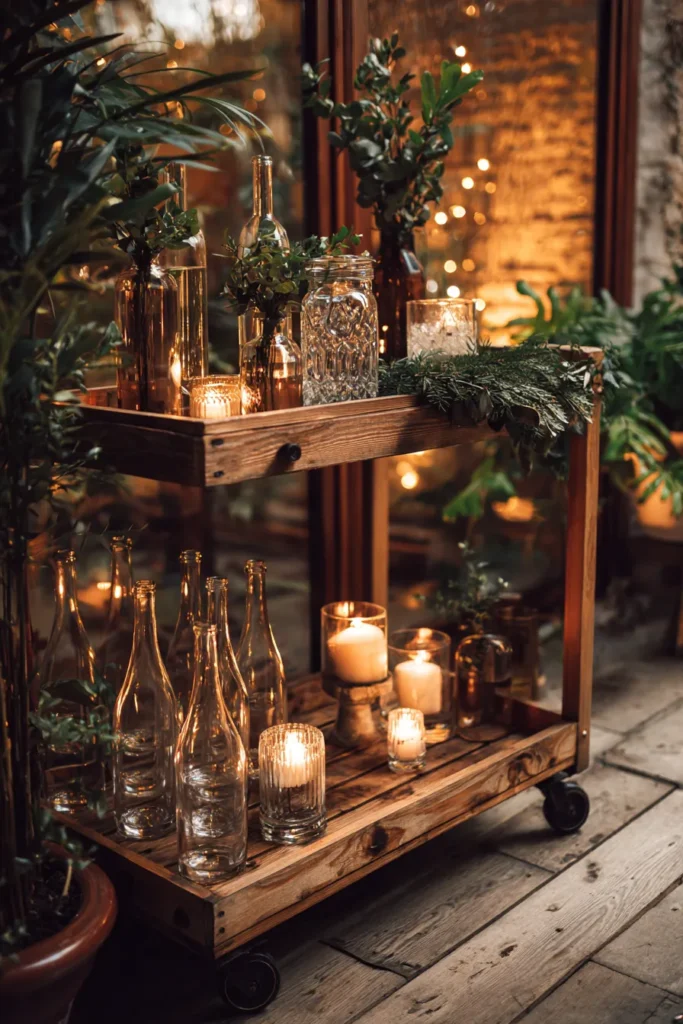 I’m absolutely smitten with this bar cart idea because it’s just so effortlessly charming and feels like something straight out of a styled shoot but totally achievable. I mean, the way the greenery pops against all those warm, flickering lights is just divine and so perfect for a winter wedding or even just a festive gathering at home. Plus, using a mix of bottle shapes and heights makes it feel really curated and interesting without being overly fussy. It’s like a little self-serve oasis of warmth and beauty, and those little twinkle lights in the background are just the cherry on top. It makes me want to grab a cozy drink and just soak in the atmosphere.