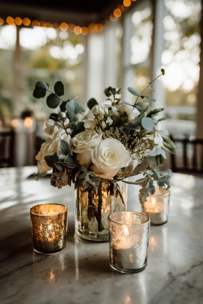 This exquisite centerpiece perfectly blends classic romance with a touch of modern greenery, ideal for an intimate winter table setting. The arrangement features a lush bouquet of creamy white roses and delicate white blooms, beautifully contrasted with soft, silvery-green eucalyptus leaves and other varied foliage, all artfully placed in a clear glass vase. The entire display rests on a light-colored marble or stone tabletop, adding a touch of understated luxury. Around the vase, several mercury glass votives with flickering candles cast a warm, dappled glow, creating an incredibly inviting and romantic ambiance, especially as the soft evening light filters through the background windows.