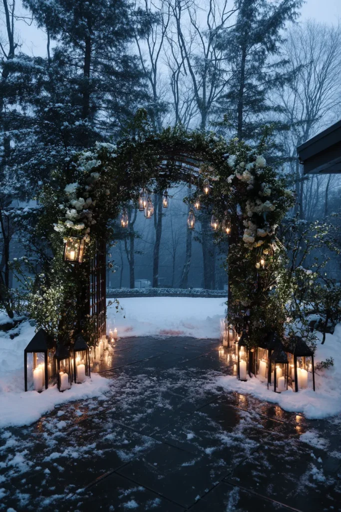 This entrance is absolutely straight out of a beautiful, snowy winter dream, setting the stage for the most romantic celebration. The gorgeous dark wooden archway is heavily adorned with thick evergreen boughs and clusters of creamy white flowers, creating a lush, frosted look. Hanging from the top are multiple small glass lanterns, each holding a flickering candle that adds a delicate, warm twinkle against the dark woods and falling snow. The path below is illuminated by large, stately black metal lanterns filled with pillar candles, which sit on the snowy ground, casting a gorgeous, inviting glow over the stone path. The overall effect is incredibly enchanting, contrasting the icy surroundings with powerful warmth.