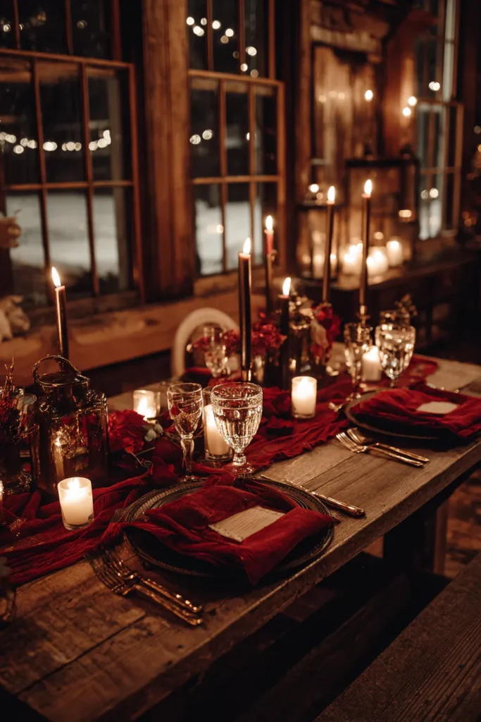 This tablescape is a magnificent display of deep, moody romance, perfect for an intimate winter dinner that feels both luxurious and rustic. The foundation is a gorgeous, rough-sawn wooden table with beautiful texture, immediately setting a cozy, farmhouse tone. Running down the center is a plush, crumpled velvet runner in a deep, rich crimson or burgundy, providing a stunning contrast to the wood. Place settings feature dark charger plates topped with folded velvet napkins, all subtly illuminated by the surrounding candlelight. The centerpiece includes various heights of dark taper candles and low votives, with small arrangements of deep red florals and greenery adding pops of texture and color.