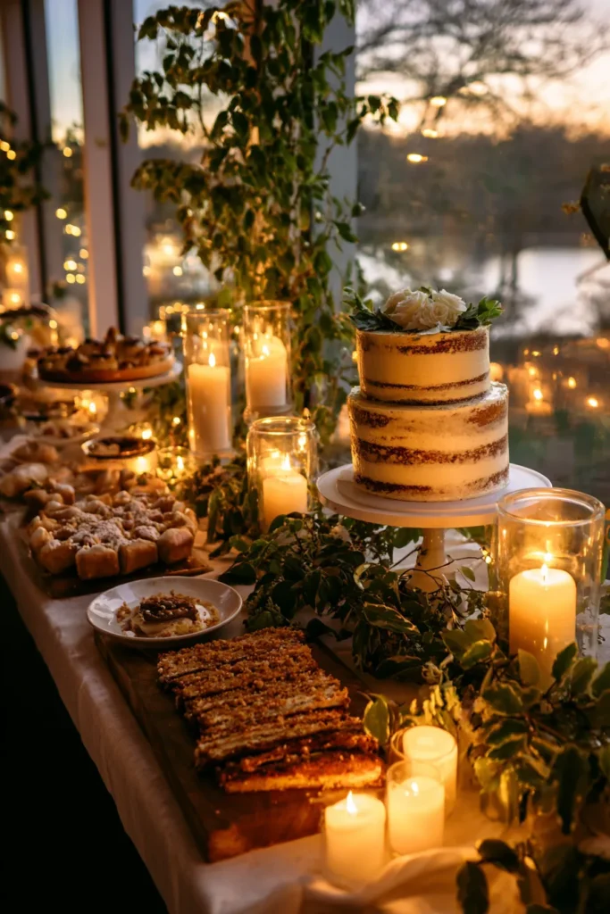This dessert display is an absolute feast for the eyes, combining delicious treats with an incredibly warm and romantic ambiance that’s just perfect for a winter celebration. The table is laden with a generous array of goodies, from beautifully baked pies and tarts to a charming, rustic “naked” two-tiered cake topped with simple greenery. Everything is arranged artfully on cutting boards, white plates, and cake stands, creating visual interest. Lush greenery and vines are draped around the table and along the windows, integrating the natural elements beautifully. The entire scene is bathed in a magical glow from countless pillar candles in glass hurricanes and smaller votives, with string lights twinkling softly in the background through the windows.