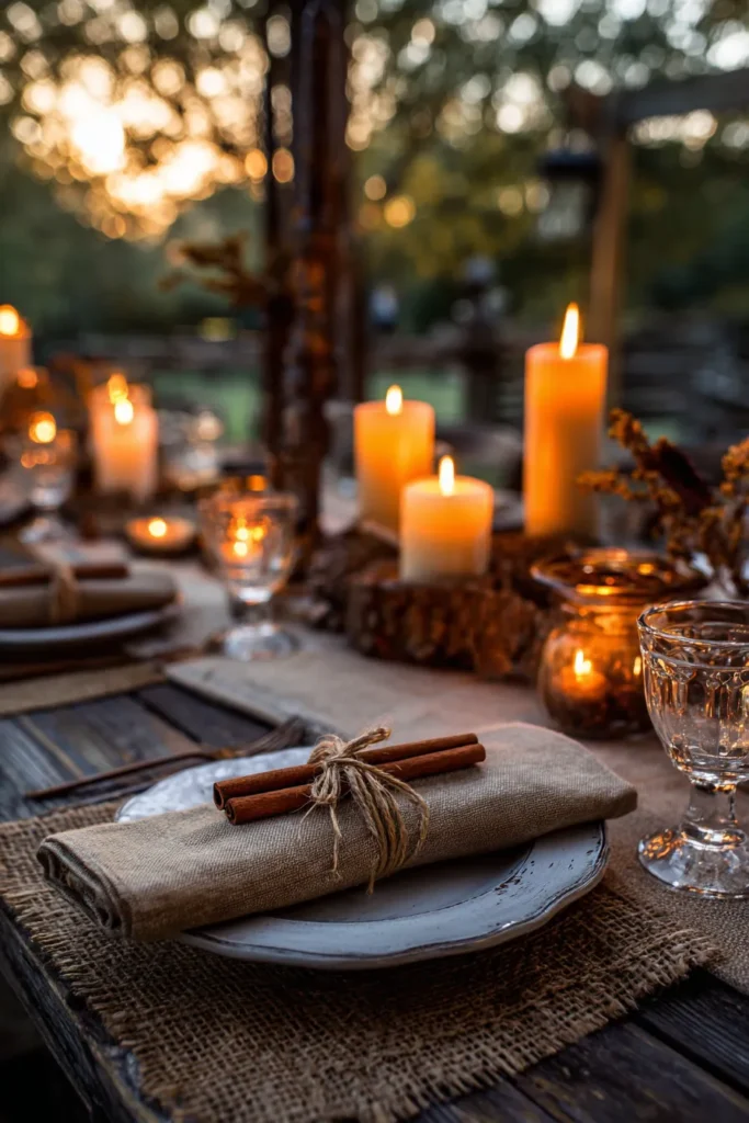 This gorgeous tablescape is all about embracing a deeply rustic, fall-meets-winter coziness with the most beautiful, earthy textures. The setting uses a dark, rough-hewn wooden table as its foundation, overlaid with runners of natural burlap for an authentic farmhouse feel. The plates are simple, off-white stoneware that looks beautifully handmade, sitting atop a smaller square of burlap for a natural placemat effect. The showstopper detail is the napkin, which is folded simply, wrapped with twine, and adorned with two aromatic cinnamon sticks—what a genius way to add scent and texture. The ambiance is set by an abundance of thick pillar candles in warm amber tones, nestled on natural wood slices for an organic centerpiece.