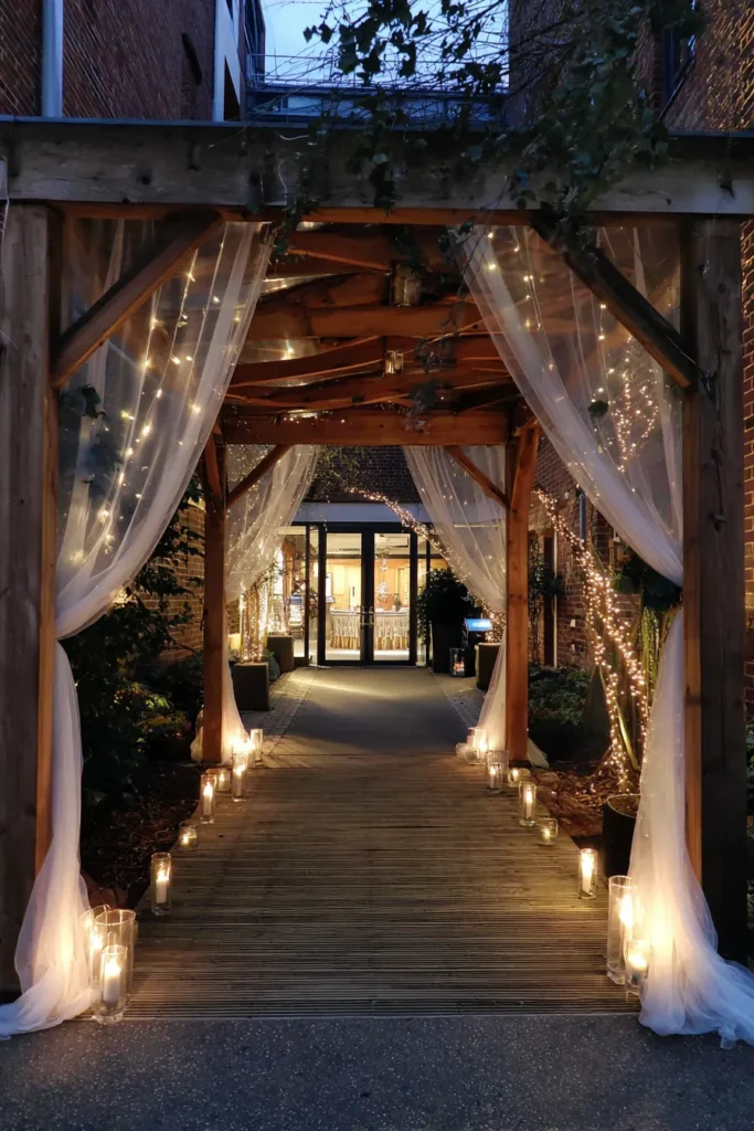 Oh my goodness, I just think this entrance is everything; it truly sets the tone for a completely enchanting evening before anyone even steps inside. The combination of the rustic wood with the sheer fabric and twinkling lights is such a genius mix of cozy and elegant, don’t you think? I especially love how the candles are protected in those tall glass cylinders, which feels so sophisticated but also super safe. Seriously, walking through this archway would feel like stepping straight into a fairytale, and I just adore how it promises warmth and romance right from the very first moment.