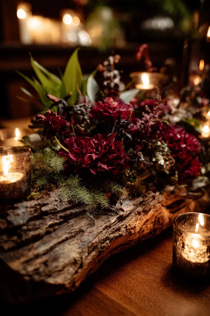 This centerpiece is a masterclass in combining moody drama with organic textures for a truly unforgettable winter table. The foundation is a stunning, weathered log or plank of raw wood, complete with gorgeous, deep bark texture, which runs down the center of the dark wooden table. Perched on top is a luxurious arrangement of deep, jewel-toned flowers, primarily rich burgundy or dark crimson blooms, mixed with vibrant dark foliage and sprigs of fresh pine for that perfect winter scent. The low, intimate lighting comes from several shimmering mercury glass votives placed directly on the table, casting a warm, flickering glow that intensifies the dark colors.