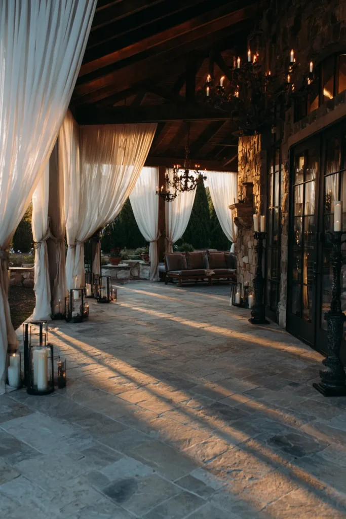 This covered patio area is absolute perfection for creating a cozy and luxurious outdoor experience, especially beautiful during twilight or an evening event. The space features a gorgeous stone wall and pillars adding a rustic, enduring charm, while the exposed wooden beams of the ceiling offer a warm, natural contrast. Flowing, sheer white drapes are strategically placed to soften the edges and create a sense of intimacy and elegance, letting that beautiful natural light filter through. The ambiance is significantly elevated by multiple wrought-iron chandeliers overhead, glittering with candles, and a stunning collection of pillar candles in varying sized black lanterns that line the stone walkway, guiding the eye toward a comfortable outdoor seating area.