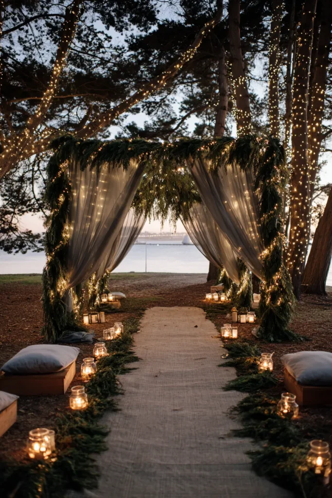 This gorgeous outdoor setup perfectly captures the wild, woodsy romance of a winter evening ceremony with a view. The focal point is a beautiful arbor, heavily draped in lush, dark evergreen boughs and accented with sheer, smoky gray fabric that billows softly in the breeze. Tiny twinkling fairy lights are woven through the entire structure and up into the surrounding pine trees, transforming the forest into a breathtaking tunnel of light. A rustic runner, possibly woven jute or linen, marks the aisle, which is flanked by thick garlands of pine and dozens of glowing jar candles nestled on the ground, casting warm light up through the trees. Cozy pillows on wooden crates offer relaxed seating for the most intimate gathering.